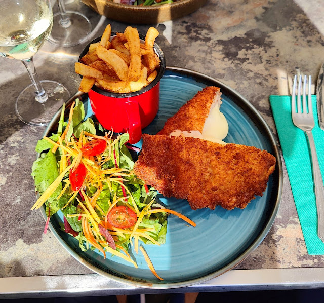 (1) Lunch at Little Boho - Salad with smoked duck breast EUR17 (mine), Cordon bleu EUR18 (his), a glass of white wine EUR4,90 each and a cup of coffee EUR1,90 each